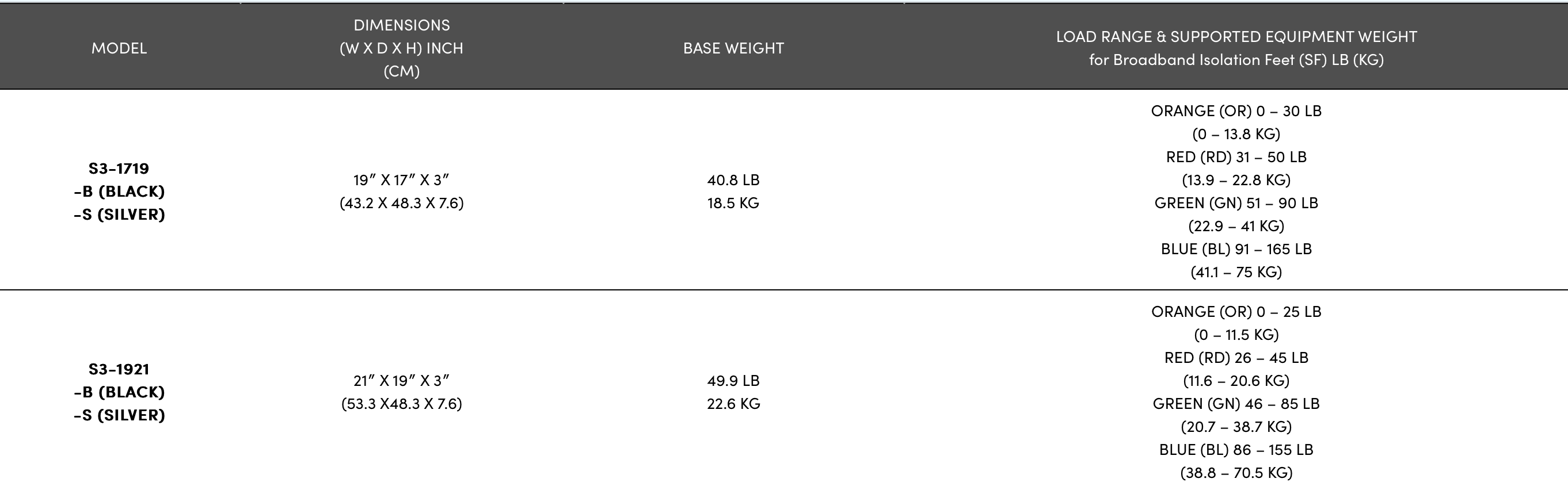 The 51 lb S3 (1921 size) plinth construction is manufactured by laminating in a vacuum press alternating layers of high-density fabric reinforced resin and non-magnetic stainless steel plates on both sides of a decoupled mass energy dissipation core system. The very top skin of the S3 plinth is the same high-quality, scratch-resistant surface layer used in the R3X and E1X Isolation Bases, providing an identical cosmetic match in systems that utilize different isolation base models in the same system. Encompassing the S3 is a billet-machined heat-treated aluminum alloy stiffening trim which is finished to exacting HRS standards for cosmetic elegance. The low profile (3-inch height) design also minimizes space requirements and keeps the visual focus of your system on the components you have selected.
