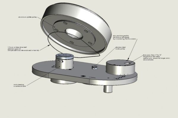 The Viella’s unique industrial design with its oval shape and cherry wood or black lacquer skirt houses many proprietary developments. These all have the specific function of lowering the vibrational noise floor. The platter bearing is self-contained in an oil bath with integral sub-platter flywheel and convex polished 18mm steel axle against a PFTE thrust pad, eliminating potential noise. The massive aluminum platter with an integral PVC record mat and decoupled spindle further isolates the stylus in the record groove. The in-house designed and hand-built Lorenzi brushless DC motor uses both a flywheel and high-mass stainless-steel machined pulley for speed stability and is decoupled from the thick aluminum plinth. The V12 includes touch capacitance speed select buttons that allow fine speed tuning, integral spirit level, outboard power supply, and easy adjustable leveling.